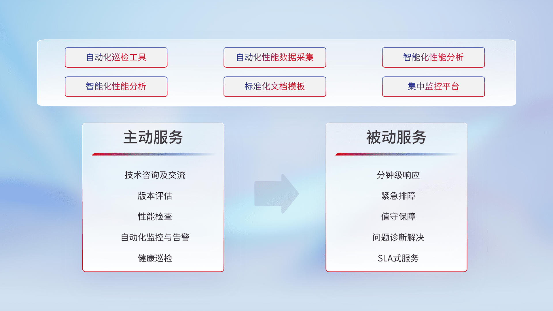 智能化工具和标准化文档,,保障服务质量,,,,提供主动服务(包含技术咨询、、、、版本评估、、、、性能检查、、自动化监控与告警、、、、健康巡检)和被动服务包含(分钟级响应、、紧急排障、、、值守保障、、、、问题诊断解决、、SLA服务)。。。